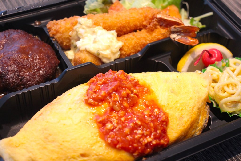 オムライス・エビフライ・ハンバーグ が詰まった「ローサ弁当」。