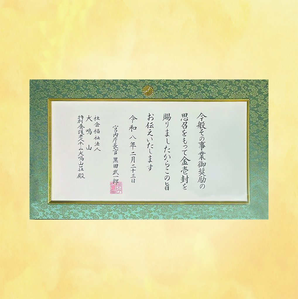 令和8年2月23日の天皇誕生日に際し、天皇陛下より社会福祉事業御奨励の思召をもって、優良民間社会福祉事業施設・団体としてお選びいただき、金一封が社会福祉法人犬鳴山 特別養護老人ホーム 犬鳴山荘に下賜されました。